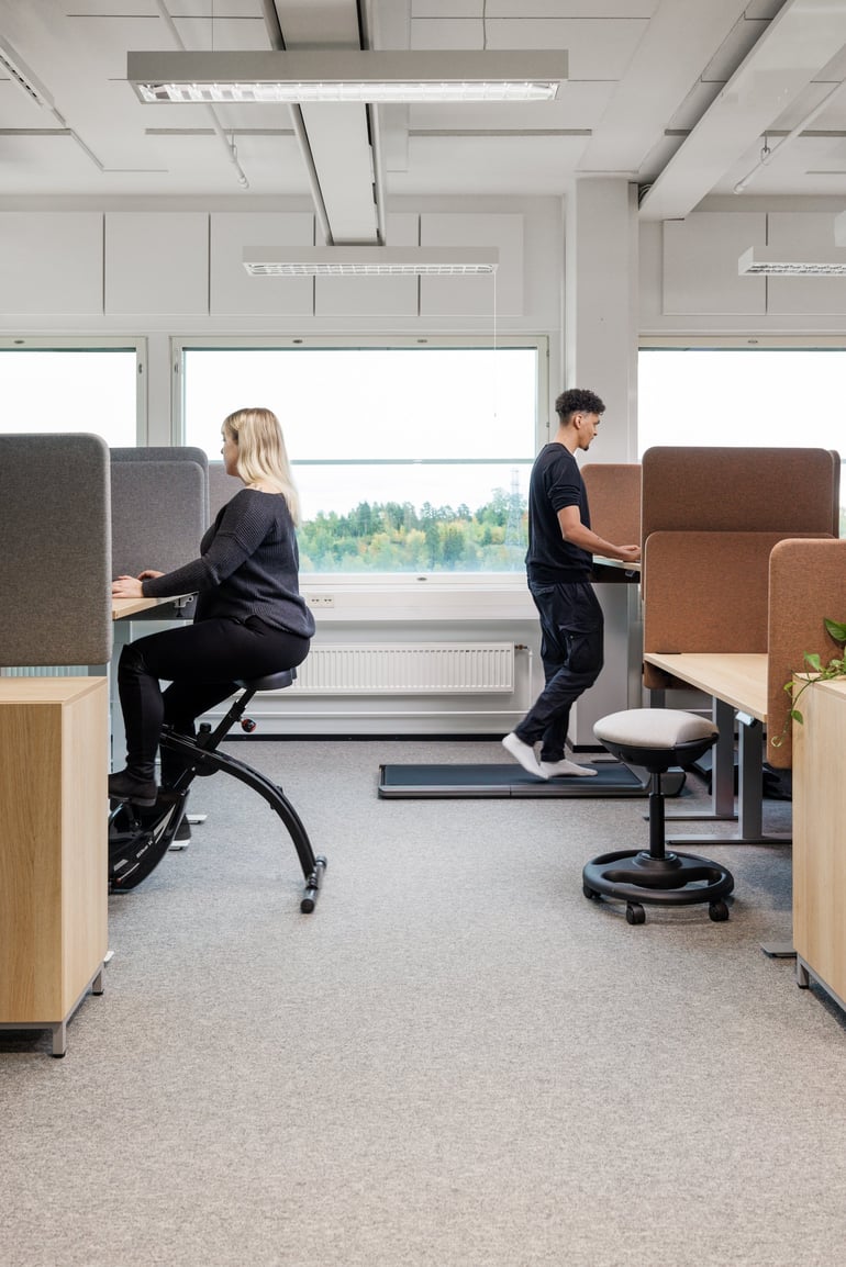 Muutto uusiin toimitiloihin oli myös panostus henkilöstön hyvinvointiin. Ergonomiset kalusteet ja aktiivista työskentelyä tukevat ratkaisut eivät ainoastaan tue työntekijöiden terveyttä, vaan toimivat myös esimerkkinä asiakkaille.
