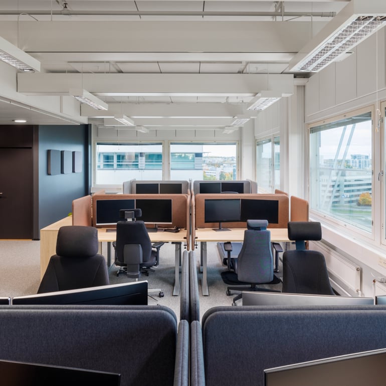 Akustiikan huomioiminen oli erityisen tärkeää, koska sillä on merkittävä vaikutus työhyvinvointiin ja keskittymiseen. Verhot, pöytäsermit ja muut avotoimiston akustiikkaa parantavat ratkaisut vähentävät puheensorinaa ja estävät äänen kaikumista. Nämä ratkaisut tekevät työtilasta viihtyisämmän ja tukevat keskittymistä.