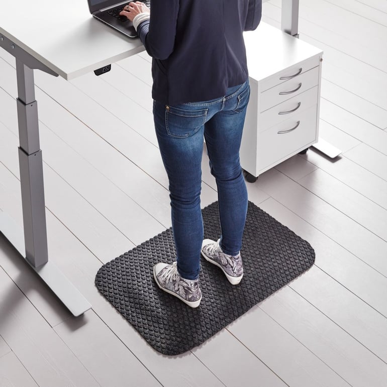 Pitkäaikainen seisominen kuormittaa kehoa ja tuntuu jaloissa. Seisten työskentelyä helpottamaan on yksinkertainen ja kustannustehokas ratkaisu: Seisontamatto, joka saa aikaan mikroliikkeitä kehossa, kun sillä seisoo.