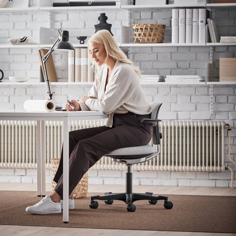 - Säädä istuimen kulmaa hieman eteenpäin. Lantion tulisi olla aavistuksen korkeammalla kuin polvet, jolloin jalkapohjat pääsevät lepäämään tasaisesti lattialla.