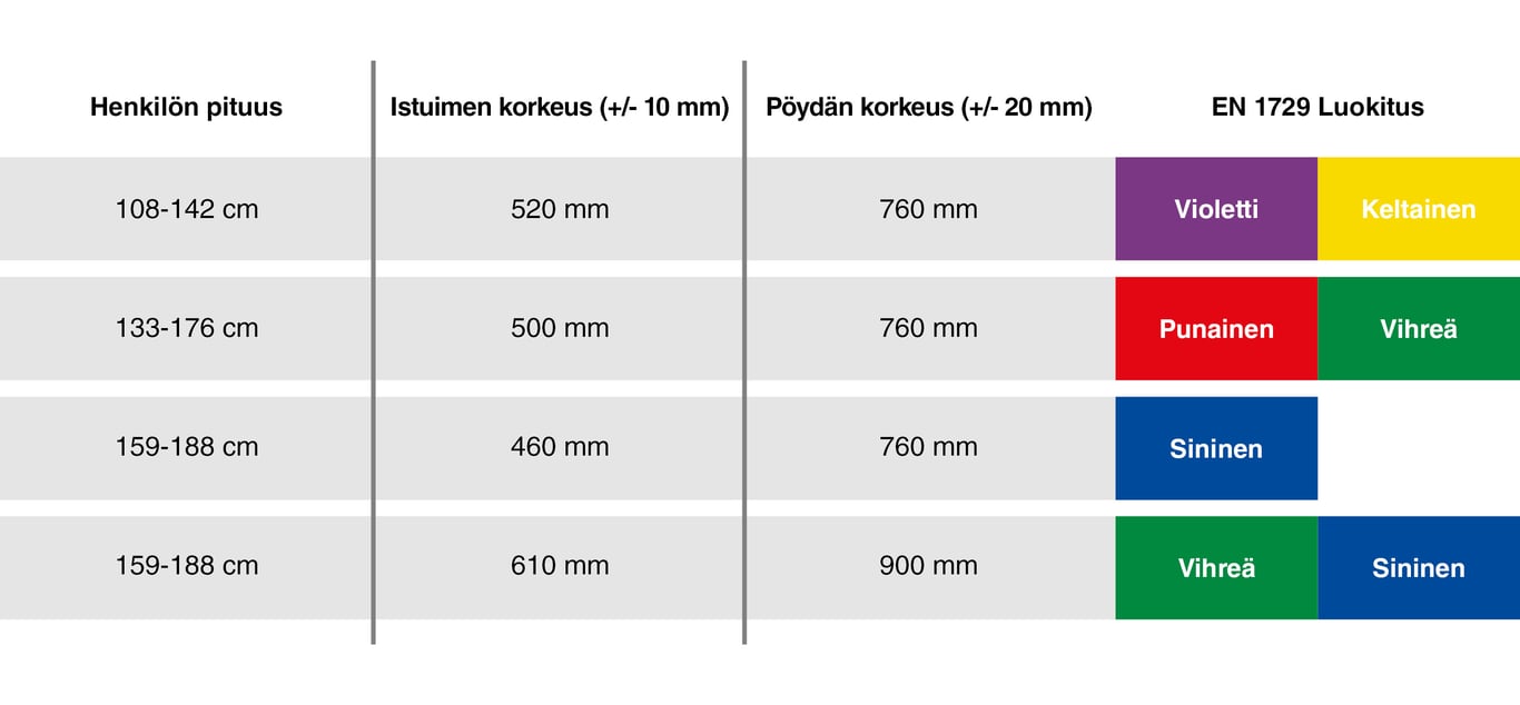 Uusi eurooppalainen standardi EN 1729 varmistaa, että koulutukseen tarkoitetut kalusteet on mukautettu sopimaan esikoulun ja koulun oppilaille sekä täyttävät tietyt laatuun ja turvallisuuteen liittyvät kriteerit. Standardin mukaisesti on tärkeää, että kalusteet on mukautettu lasten pituuteen, koska oikeanlainen istuma-asento on edellytys lasten oppimiselle.