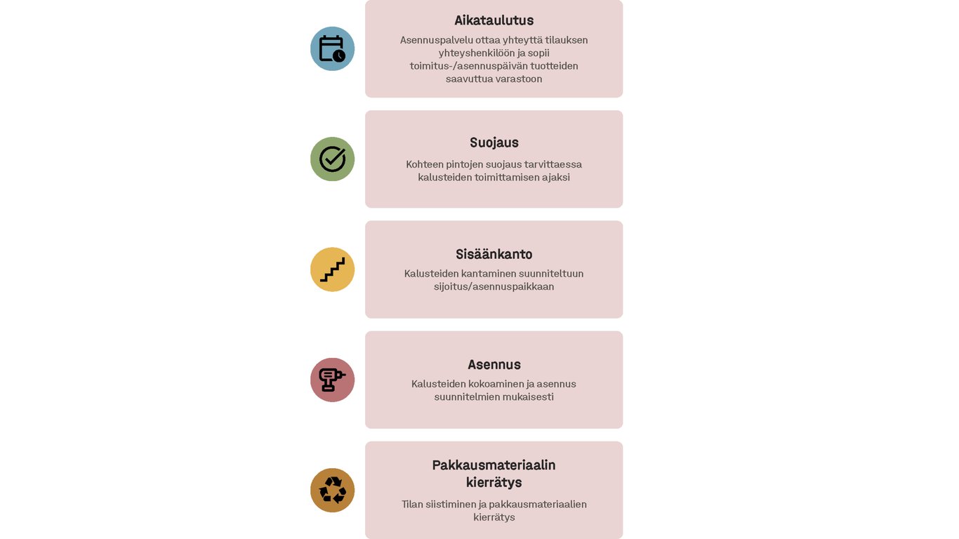 Säästä aikaa ja rahaa asennuspalvelumme avulla. Tuotteet kuljetetaan tiloihisi, kootaan ja valmistellaan käyttöön kokeneiden asentajien toimesta. Lue lisää tarjoamastamme asennuspalvelusta ja mitä sinun tulisi ottaa huomioon ennen kalusteiden asennusta.